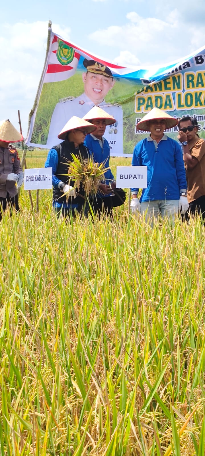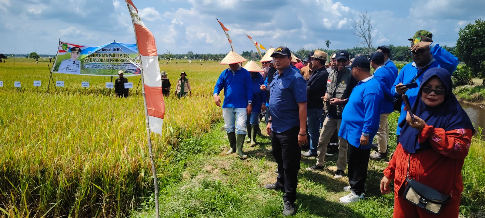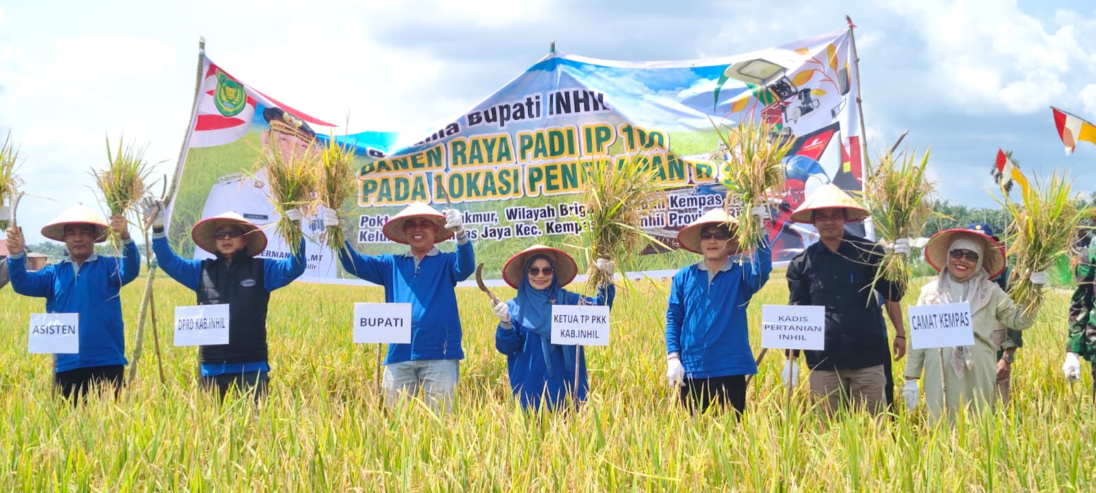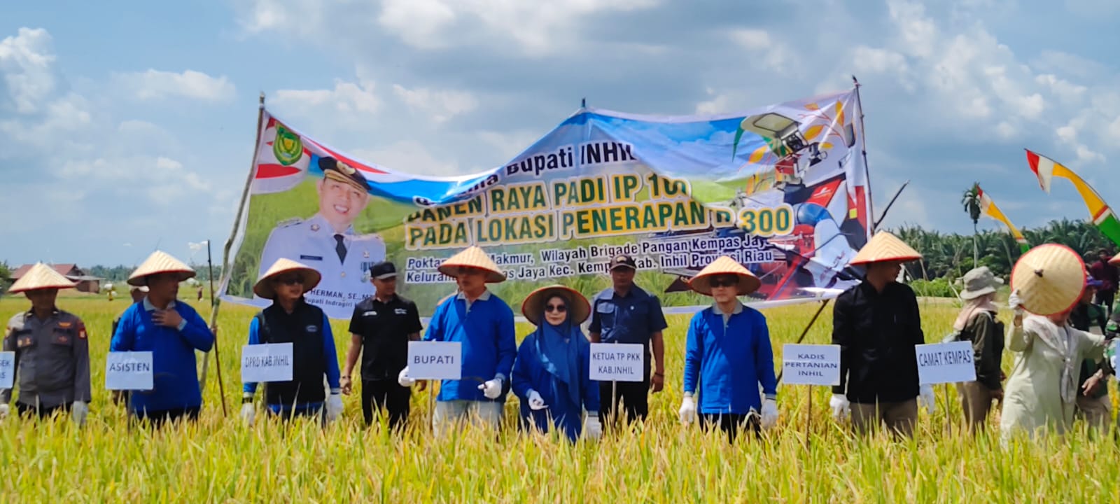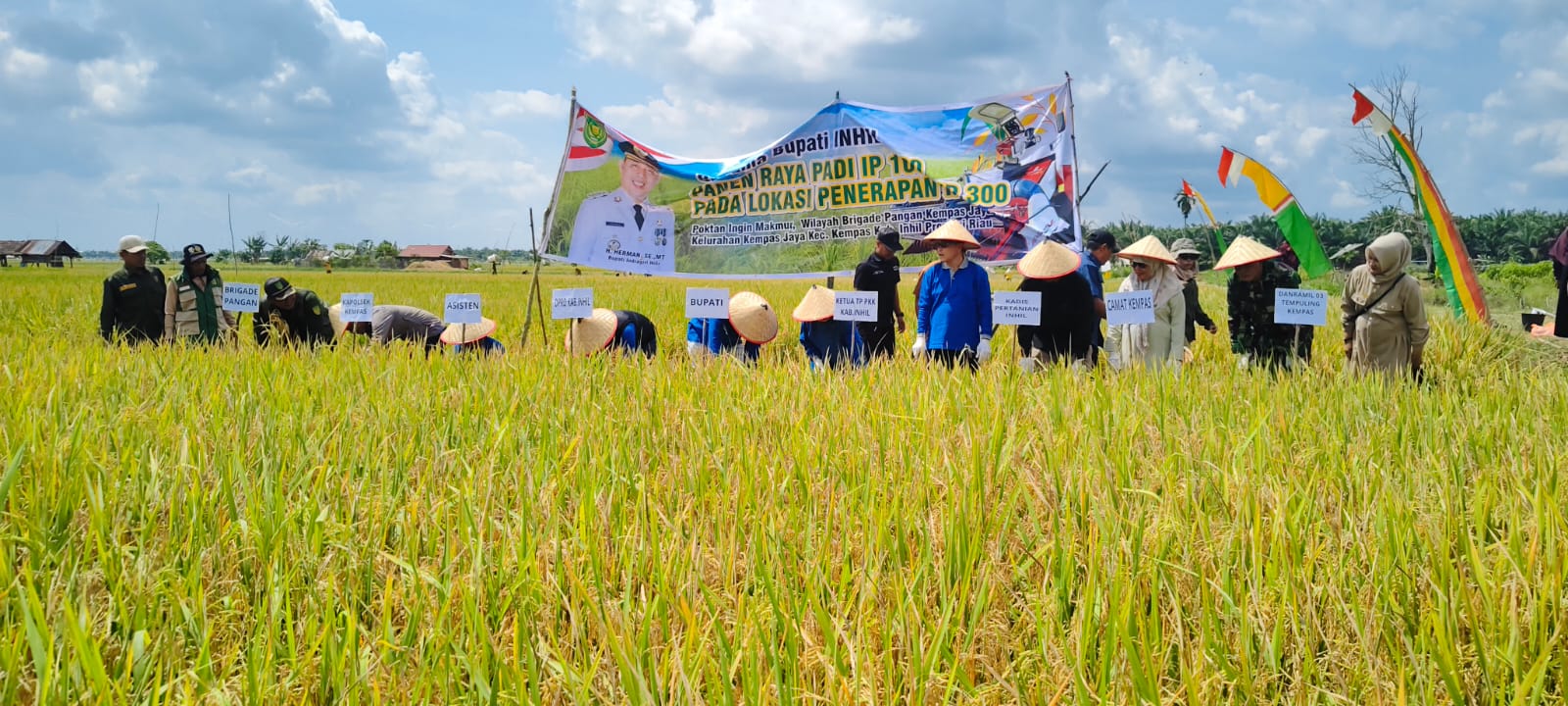Kempas — Bupati Indragiri Hilir (Inhil) H. Herman, bersama Ketua TP PKK Kabupaten Inhil Hj. Katerina Susanti Herman, menghadiri Panen Raya Padi Perdana Tanam Indeks Pertanaman (IP) 300 dan Panen IP 100 di wilayah kerja Brigade Pangan Kempas Jaya II, Kecamatan Kempas, Minggu 25 Januari 2025 yang turut dihadiri Wakil Ketua I DPRD Kabupaten Inhil, unsur Forkopimda Kabupaten Inhil, Camat Kempas, Lurah Kempas Jaya, para kepala desa se-Kecamatan Kempas, koordinator Balai Penyuluhan Pertanian (BPP), petugas Penyuluh Pertanian Lapangan (PPL), ketua brigade pangan desa, ketua kelompok tani, ketua pemuda, serta undangan lainnya.