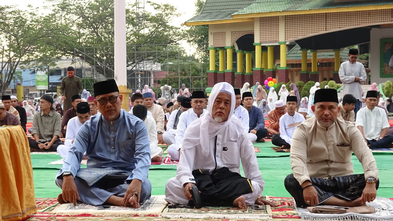 Indragiri Hilir – Ribuan masyarakat memadati Lapangan Gajah Mada, Tembilahan, untuk melaksanakan Sholat Idul Fitri 1 Syawal 1447 Hijriah, Sabtu (21/3/2026). Momentum penuh khidmat ini turut dihadiri Sekretaris Daerah Kabupaten Indragiri Hilir (Inhil), Tantawi Jauhari.